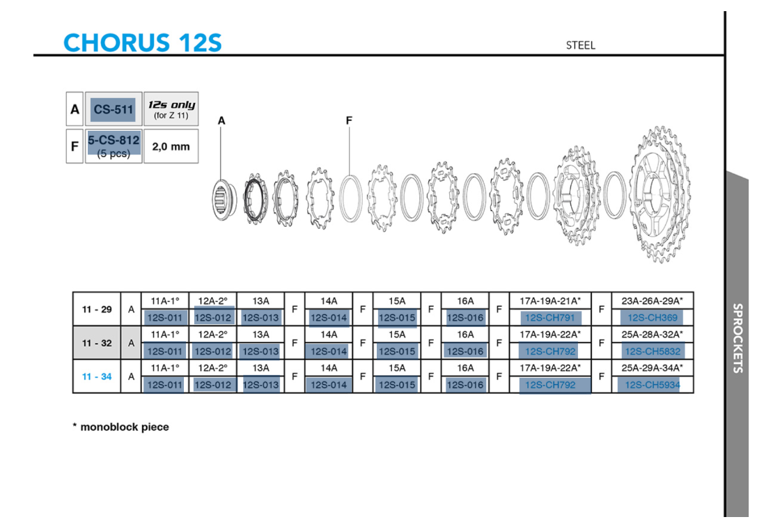 De Chorus groepset is volledig compatibel met de cassettes die zijn geïntroduceerd bij de Super Record en Record 2×12-speed groepen (11-29 en 11-32). Daarnaast introduceert deze groep een nieuwe cassettespecificatie (11-34), die exclusief compatibel is met de Chorus 12-speed aandrijflijn.